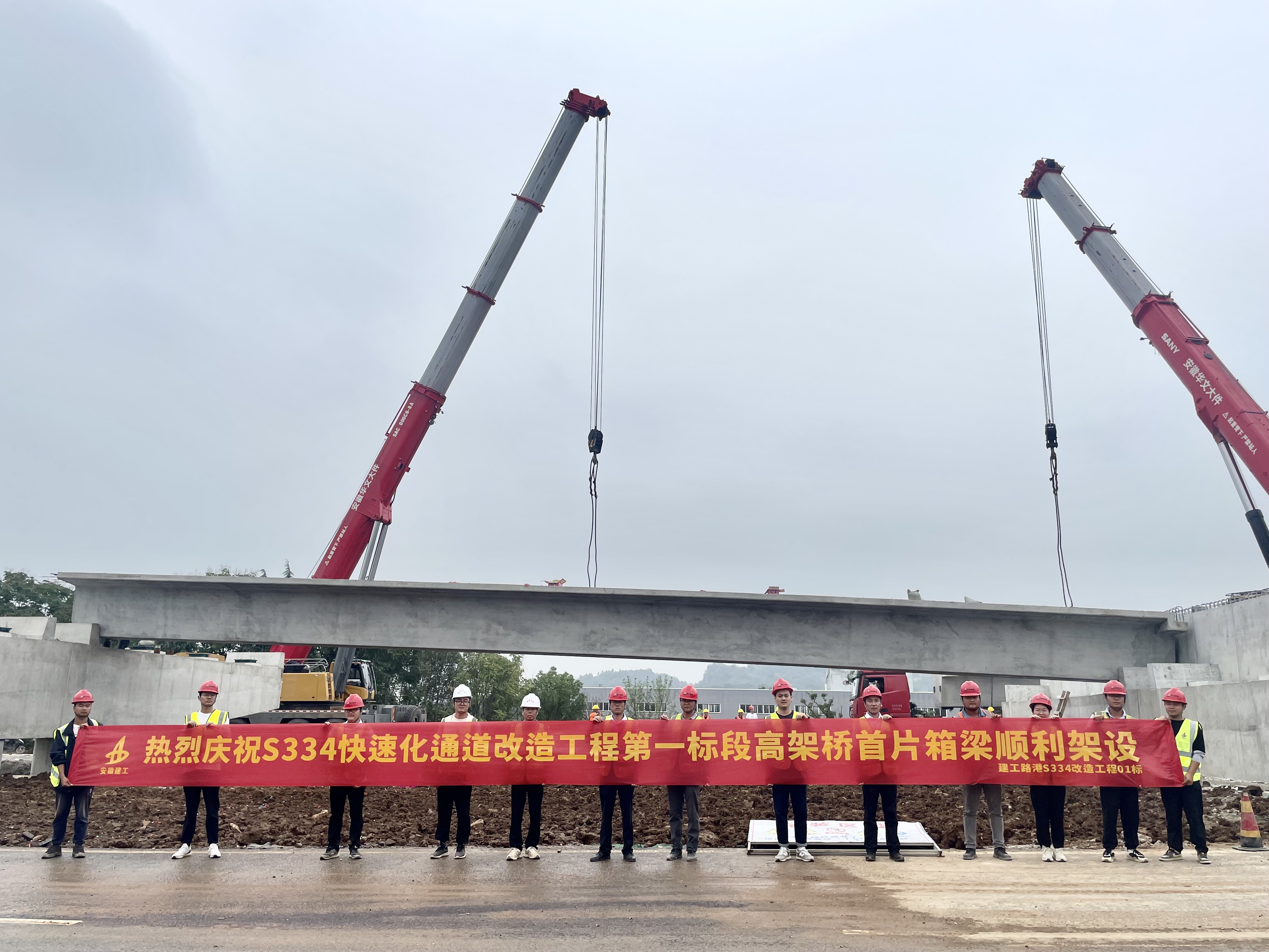 S334(長(zhǎng)江南路至繁陽(yáng)大道段)快速化通道改造工程第一標(biāo)段首片預(yù)制箱梁架設(shè)成功