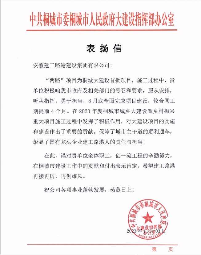 11月3日,桐城市城鄉(xiāng)建設(shè)暨鄉(xiāng)村振興重大項(xiàng)目部收到桐城市人民政府大建設(shè)指揮部表揚(yáng)信,信中對(duì)桐城大建設(shè)“兩路”項(xiàng)目所取得的成績(jī)提出表揚(yáng)。
