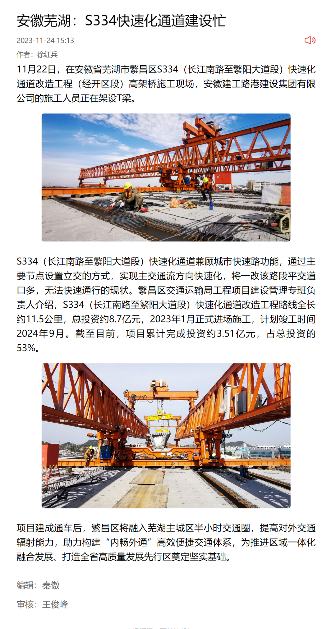 交通強(qiáng)國(guó)以《安徽蕪湖:S334快速化通道建設(shè)忙》為題,詳細(xì)介紹了項(xiàng)目的進(jìn)展情況。