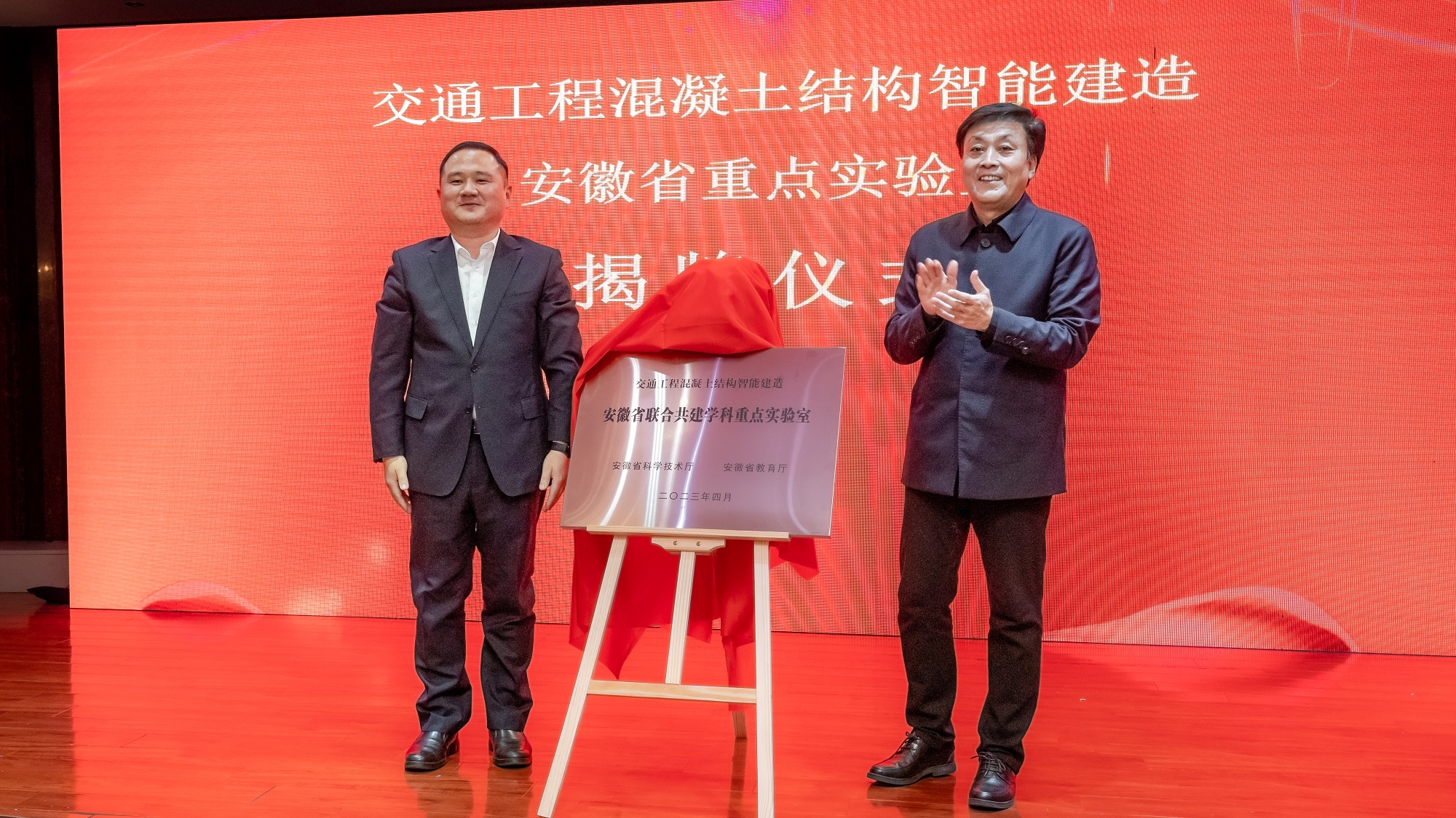 魏軍鋒和公司董事長錢葉琳共同為交通工程混凝土結(jié)構(gòu)智能建造安徽省聯(lián)合共建學(xué)科重點(diǎn)實(shí)驗(yàn)室揭牌,為船閘智能建造開辟新的研究平臺。