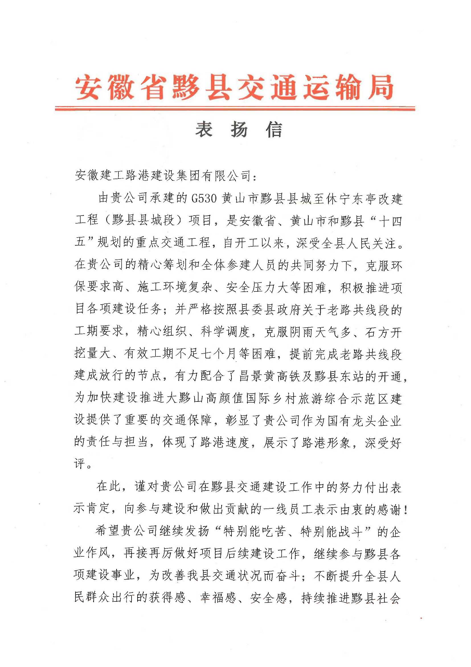 近日,G530黃山市黟縣縣城至休寧東亭改建項目收到黟縣交通運輸局的表揚信。