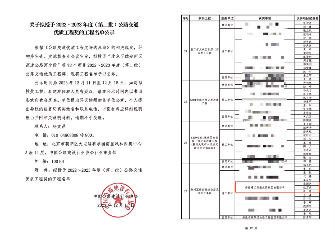 近日,中國公路建設(shè)行業(yè)協(xié)會發(fā)布了“2022~2023年度公路交通優(yōu)質(zhì)工程獎的工程名單”,我公司承建的銅陵市G347普濟圩至樅陽段建設(shè)工程和滁州至淮南高速公路定遠至長豐段2項目榮獲該項殊榮。