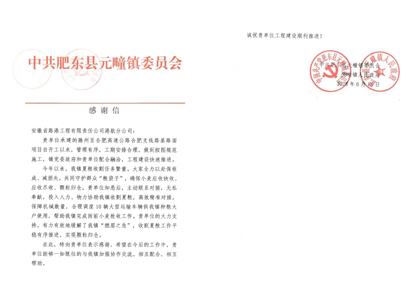 近日,滁河支線項(xiàng)目部收到中國共產(chǎn)黨肥東縣元疃鎮(zhèn)委員會、肥東縣元疃鎮(zhèn)人民政府感謝信,對項(xiàng)目部在當(dāng)?shù)叵募Z收割過程中所給予的幫助表示感謝。