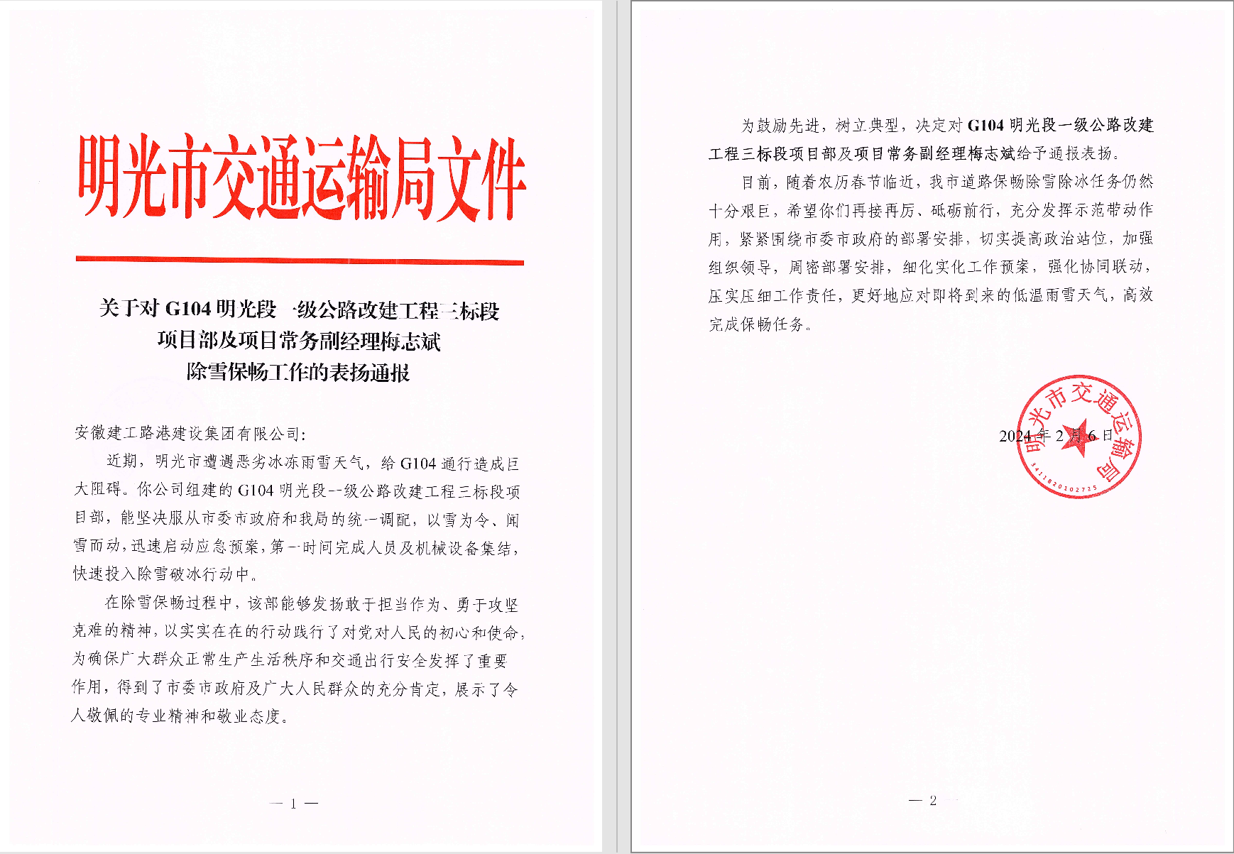 近日,建工路港 G104一級公路改建工程三標段項目部明光市交通運輸局給項目部發(fā)來了表信。