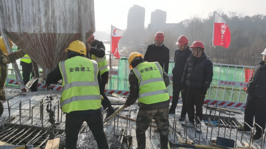 在桐城大建設(shè)龍眠新橋項(xiàng)目的施工現(xiàn)場(chǎng),吊車、挖掘機(jī)等施工機(jī)械來往作業(yè),項(xiàng)目部成員及施工人員堅(jiān)守崗位,全力保障橋面施工。
