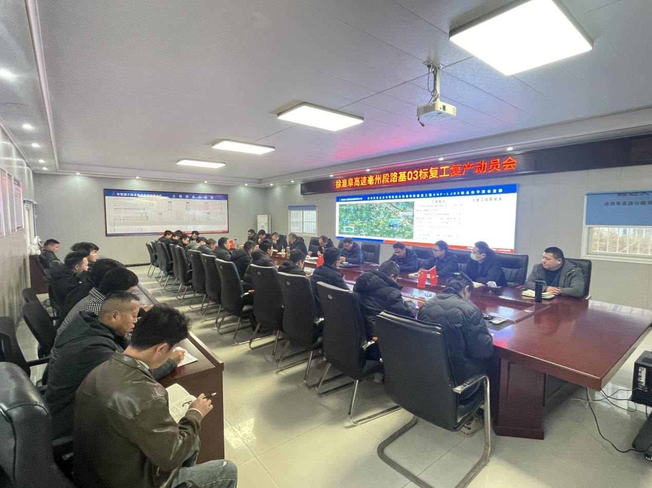 徐淮阜亳州段路基03標(biāo)項(xiàng)目于2月19日上午組織召開復(fù)工復(fù)產(chǎn)動(dòng)員會(huì),助力全體干部職工從春節(jié)長(zhǎng)假中迅速調(diào)整工作狀態(tài),重整行裝再出發(fā),全力以赴謀劃新一年工作,為2024年的各項(xiàng)工作開好局、起好步。