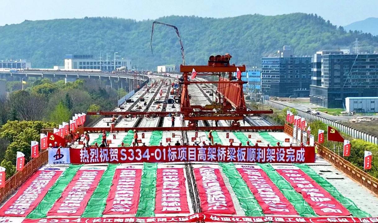 經(jīng)過300多個日日夜夜的艱苦奮斗,4月1日,在各參建單位的共同支持下,由建工路港承建的S334(長江南路至繁陽大道段)快速化通道改造工程第一標(biāo)段K4+009高架橋梁板順利架設(shè)完成。