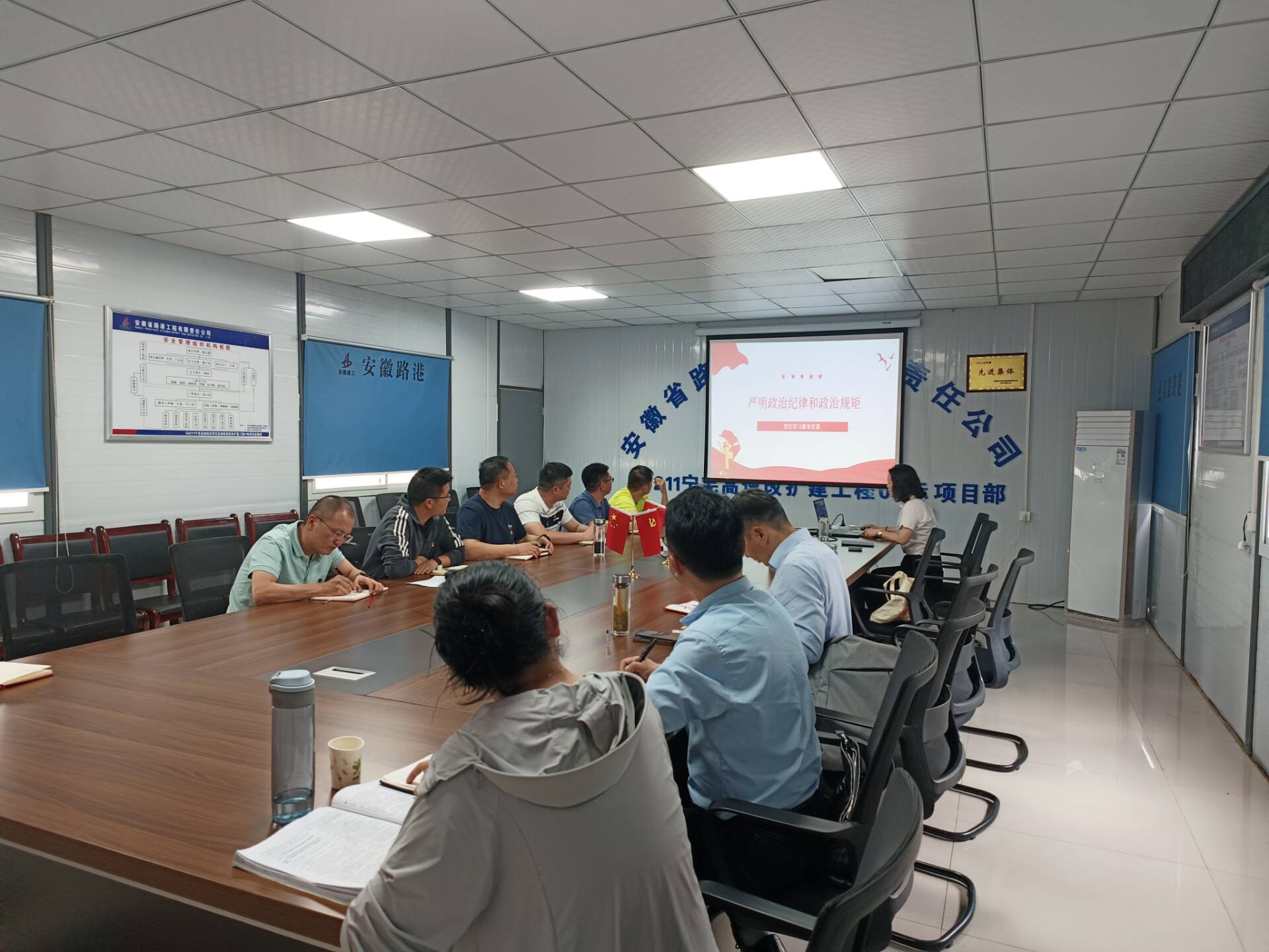 5月9日,建工路港路橋分公司黨總支副書記、副經(jīng)理王偉芬到馬鞍山項目聯(lián)合黨支部上黨紀(jì)學(xué)習(xí)教育專題黨課。