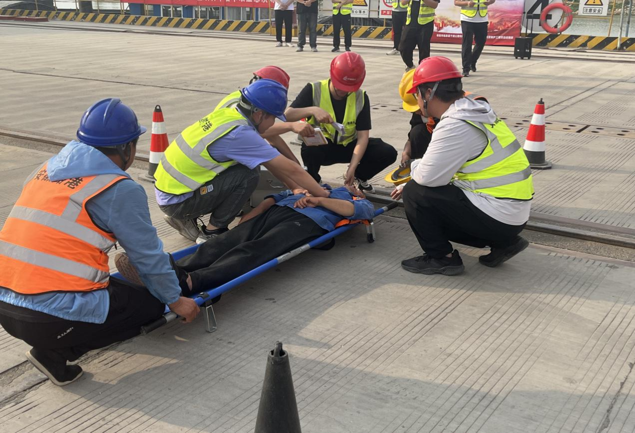 本次演練模擬工人在高溫環(huán)境中長時間工作,頭暈、眼花、四肢無力癱倒在地的中暑事件,項目立即啟動應急預案,領導小組、現(xiàn)場警戒組、應急救援組、后勤保障組等緊密協(xié)作、默契配合,順利完成事故演練。
