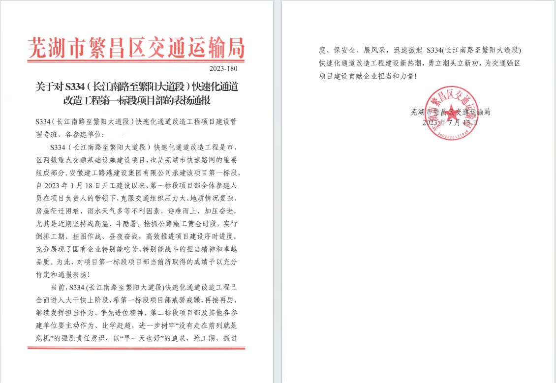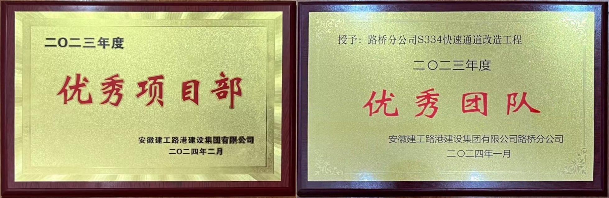 S334快速化改造項(xiàng)目獲公司2023年度優(yōu)秀項(xiàng)目部及路橋分公司2023年度優(yōu)秀團(tuán)隊(duì)