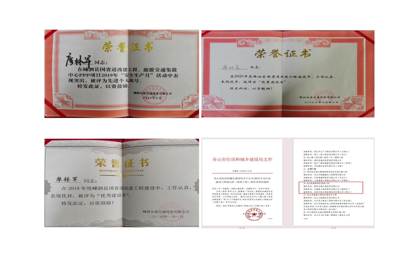 526國(guó)道嵊泗項(xiàng)目獲得了 2024 年舟山市建設(shè)工程海山杯(優(yōu)質(zhì)工程)獎(jiǎng),廖林軍也積累了豐富的施工管理經(jīng)驗(yàn),多次被項(xiàng)目公司評(píng)為“優(yōu)秀建設(shè)者”。