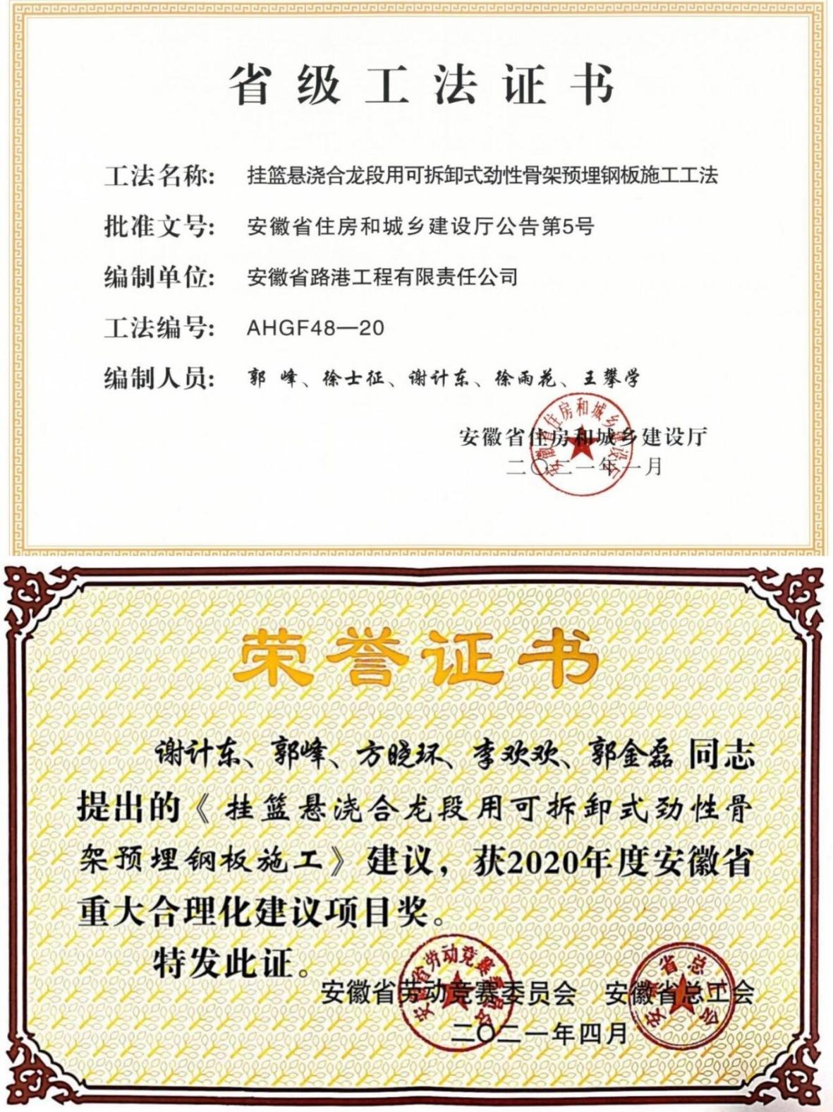 工法和合理化建議證書