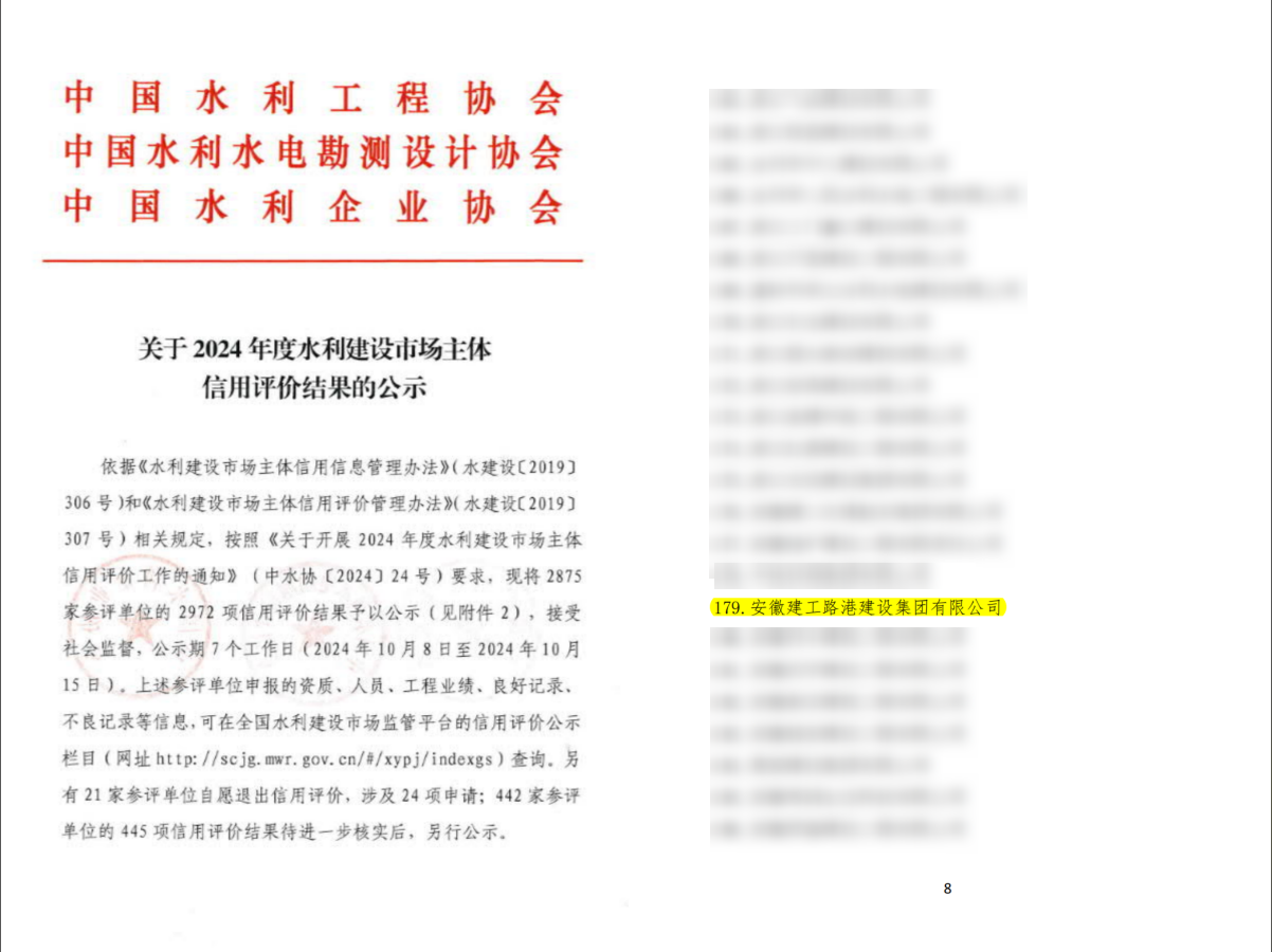 近日,從中國(guó)水利工程協(xié)會(huì)傳來(lái)喜訊,公司成功通過(guò)了2024年度水利建設(shè)市場(chǎng)主體信用評(píng)價(jià),榮獲“AAA”級(jí)認(rèn)證。這是對(duì)公司長(zhǎng)期以來(lái)在水利建設(shè)領(lǐng)域取得的成果和實(shí)力的充分肯定。
