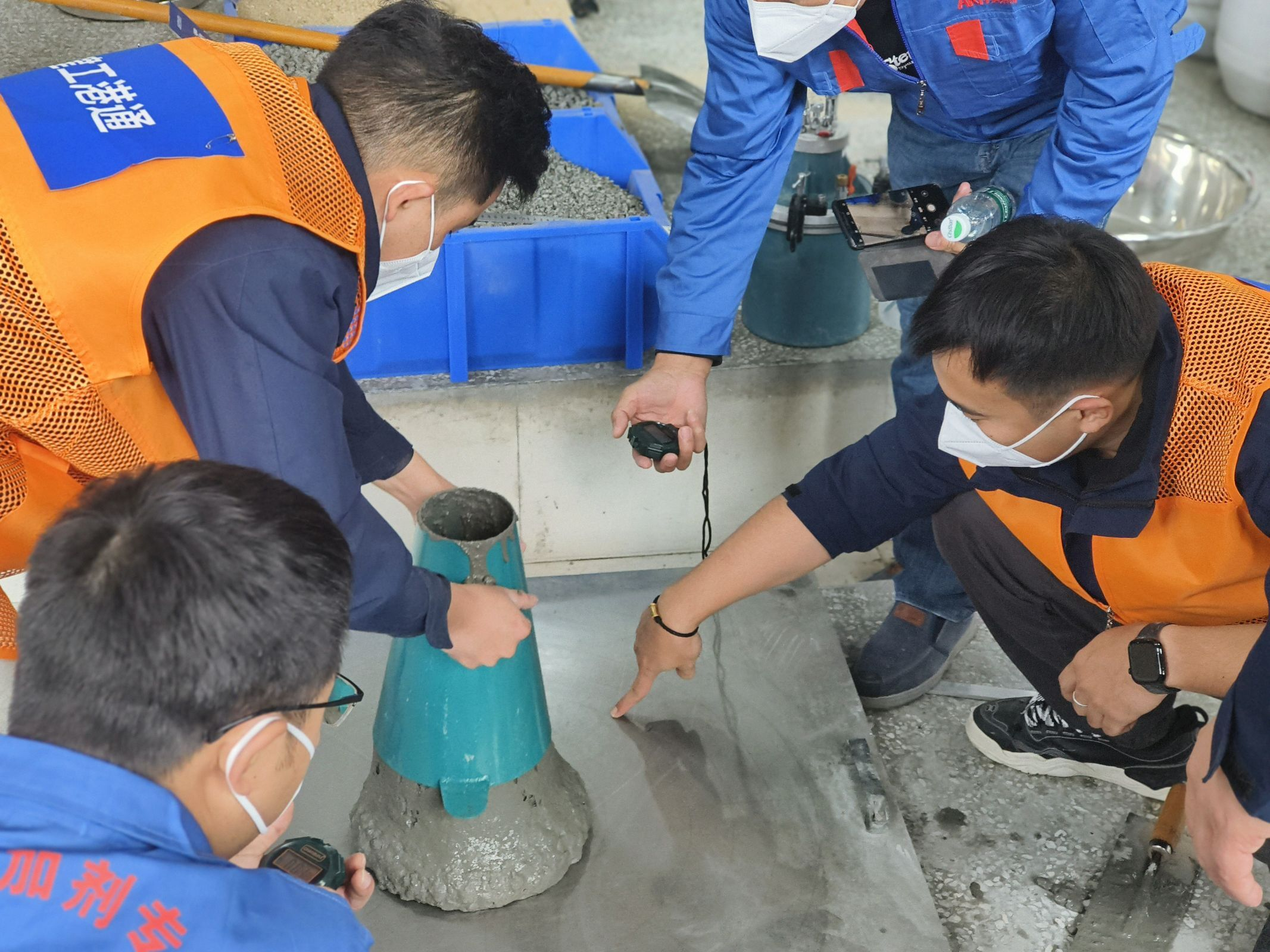 活動中,技術(shù)人員從配合比的規(guī)范性、科學(xué)性、經(jīng)濟性著手,設(shè)計出混凝土基準(zhǔn)配合比進行現(xiàn)場試拌,同時現(xiàn)場調(diào)配外加劑配方,確保混凝土各項工作性能達標(biāo)。試驗過程中,技術(shù)人員展現(xiàn)出良好的精神風(fēng)貌和專業(yè)的技能操作,贏得評委老師們的一致好評。