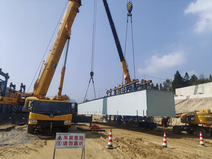 11月23日,建工路港涇青高速三分部AK0+723匝道橋首段箱梁隨著兩臺(tái)吊車緩緩升起,于高空之中平穩(wěn)地進(jìn)行縱移和橫移操作,最終緩緩落于指定位置,首片鋼箱梁順利完成吊裝。