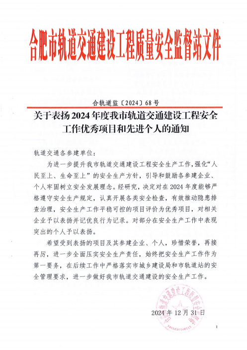喜訊!建工路港軌道交通7號(hào)線項(xiàng)目榮獲2024年度合肥市軌道交通建設(shè)工程“安全工作優(yōu)秀項(xiàng)目”稱號(hào)