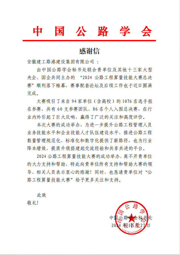 近日,中國(guó)公路學(xué)會(huì)向公司發(fā)來(lái)感謝信,感謝公司在“2024公路工程算量技能大賽總決賽”活動(dòng)中所做出的積極貢獻(xiàn)。在此次全國(guó)算量大賽活動(dòng)中,公司積極籌備,開展預(yù)賽選拔及過(guò)程培訓(xùn),最終參賽學(xué)員取得了優(yōu)異的成績(jī)。