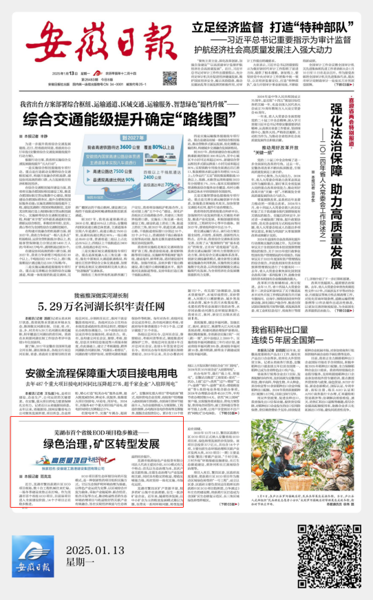 日前,安徽日報頭版以“蕪湖市首個省級EOD項目穩(wěn)步推進——綠色治理,礦區(qū)轉(zhuǎn)型發(fā)展”為題,專題報道了由建工路港承建蕪湖市繁昌荻港片區(qū)EOD項目建設(shè)情況,肯定了項目建設(shè)對蕪湖社會經(jīng)濟發(fā)展的重要意義。