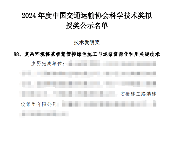 近日,中國(guó)交通運(yùn)輸協(xié)會(huì)公布了2024年度科學(xué)技術(shù)獎(jiǎng)獲獎(jiǎng)名單,建工路港“復(fù)雜環(huán)境樁基智慧管控綠色施工與泥漿資源化利用關(guān)鍵技術(shù)”榮獲技術(shù)發(fā)明獎(jiǎng)一等獎(jiǎng)。