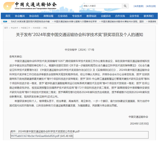 “中國(guó)交通運(yùn)輸協(xié)會(huì)科學(xué)技術(shù)獎(jiǎng)”是由國(guó)家科學(xué)技術(shù)獎(jiǎng)勵(lì)工作辦公室批準(zhǔn)設(shè)立,旨在獎(jiǎng)勵(lì)中國(guó)交通運(yùn)輸領(lǐng)域中做出突出貢獻(xiàn)的單位和個(gè)人,是國(guó)家科技獎(jiǎng)勵(lì)的重要組成部分,被業(yè)內(nèi)譽(yù)為“全國(guó)交通運(yùn)輸行業(yè)最高科技獎(jiǎng)”。