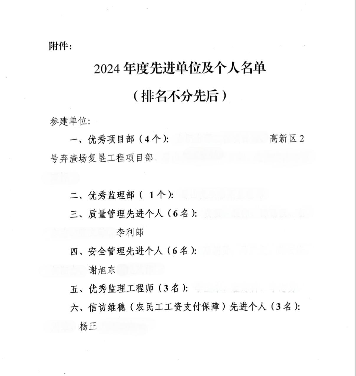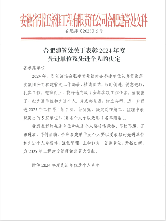 1月23日,建工路港高新區(qū)2號棄渣場復(fù)墾工程項(xiàng)目部受到業(yè)主單位安徽省引江濟(jì)淮工程有限責(zé)任公司合肥建管處表彰,合肥建管處授予項(xiàng)目部“優(yōu)秀項(xiàng)目部”榮譽(yù)稱號,授予項(xiàng)目職工李利郎“質(zhì)量管理先進(jìn)個(gè)人”、謝旭東“安全管理先進(jìn)個(gè)人”、楊正“信訪維穩(wěn)(農(nóng)民工工資支付保障)先進(jìn)個(gè)人”榮譽(yù)稱號。
