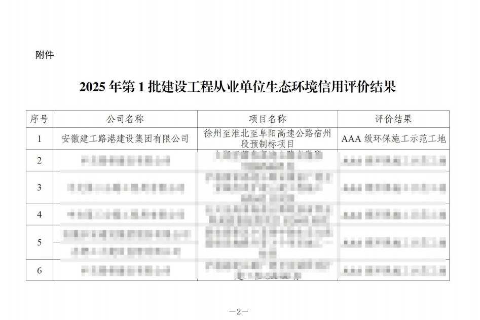 近日,安徽省環(huán)境保護(hù)產(chǎn)業(yè)協(xié)會(huì)公布了2025年第1批建設(shè)工程從業(yè)單位生態(tài)環(huán)境信用評(píng)價(jià)名單,由建工路港承建的徐州至淮北至阜陽(yáng)高速公路宿州段預(yù)制標(biāo)項(xiàng)目榮獲“AAA級(jí)環(huán)保施工示范工地”榮譽(yù)稱號(hào)。