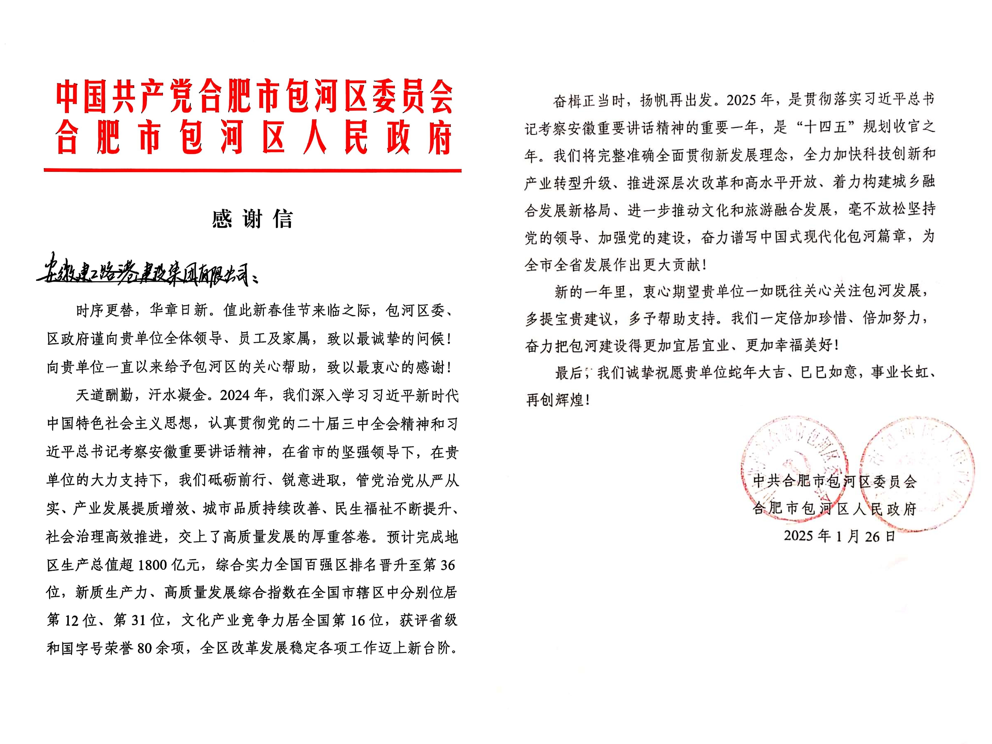 1月26日,建工路港關(guān)麓路建設(shè)工程項目收獲包河區(qū)人民政府感謝信。