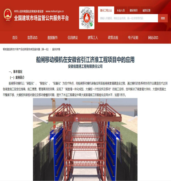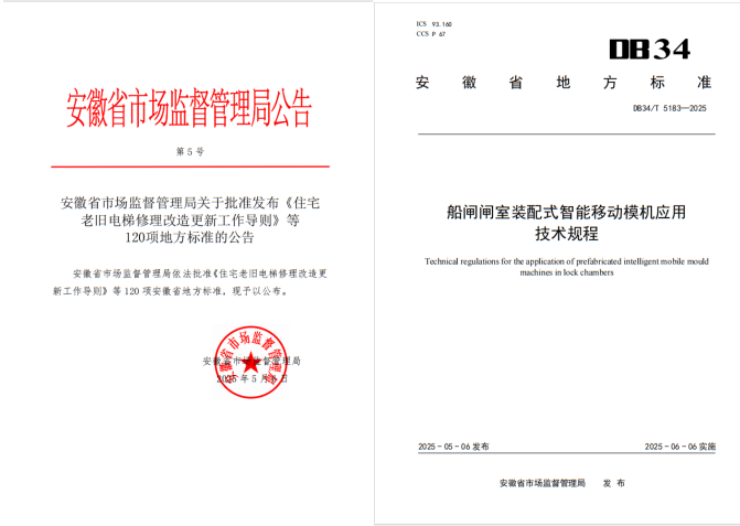 近日,安徽省市場監(jiān)督管理局發(fā)布了2025年度安徽省地方標(biāo)準(zhǔn)公告名單,建工股份、建工路港公司主編的《船閘閘室裝配式智能移動模機應(yīng)用技術(shù)規(guī)程》(DB34T 5183—2025)正式落地實施。該標(biāo)準(zhǔn)是全國首部針對船閘智能建造的技術(shù)規(guī)程,不僅為安徽船閘工程建造技術(shù)革新提供了堅實的規(guī)范指引,更標(biāo)志著全國水運基礎(chǔ)設(shè)施建設(shè)領(lǐng)域邁入了新的里程。