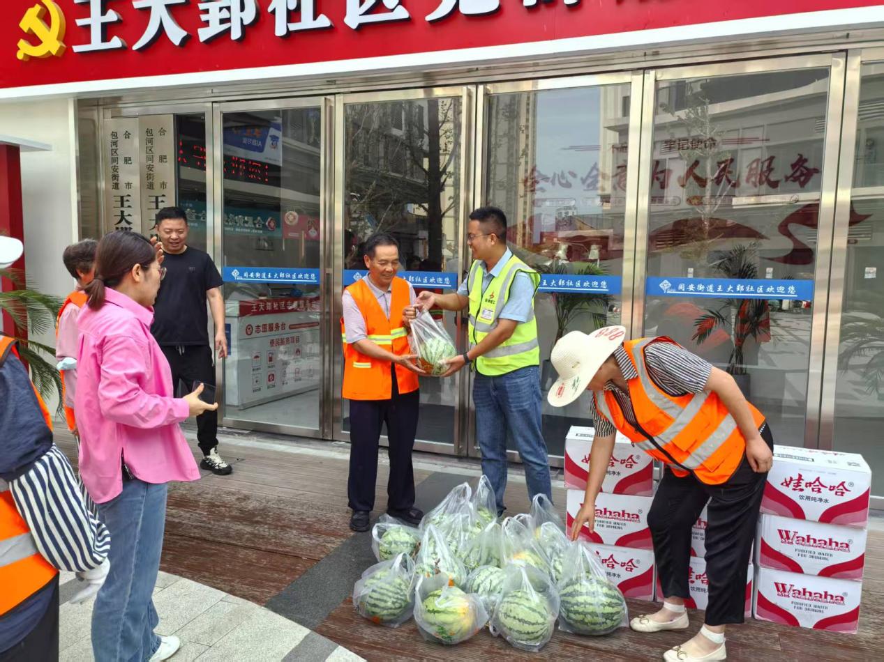 在王大郢社區(qū)黨群服務中心,社居委聯(lián)合項目部為高溫下堅守崗位的環(huán)衛(wèi)工人、社區(qū)志愿者及居民代表送上防暑降溫物資,有效拉近了社區(qū)、居民與企業(yè)之間的情感聯(lián)系。