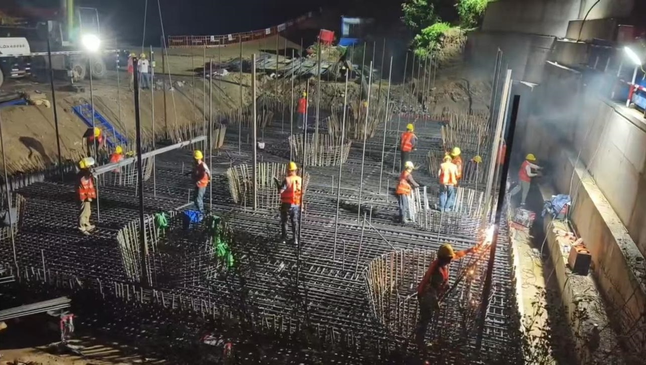 面對白天的高溫,建設(shè)者們的施工熱情絲毫未減。在電焊作業(yè)區(qū)域,火花四濺,操作人員全神貫注地投入到每一個(gè)焊接點(diǎn),以精湛的技藝和嚴(yán)謹(jǐn)?shù)膽B(tài)度,嚴(yán)格把控施工質(zhì)量,展現(xiàn)了項(xiàng)目建設(shè)者精益求精的職業(yè)精神。夜幕低垂,施工現(xiàn)場燈火通明,機(jī)械轟鳴與調(diào)度指令聲此起彼伏,每一位作業(yè)人員都堅(jiān)守崗位、各司其職,確保每一道工序都能緊密銜接、高效推進(jìn)。