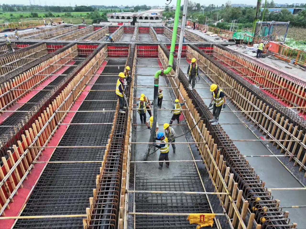 為確保此次大體積混凝土澆筑作業(yè)順利推進,建設、施工、監(jiān)理三方緊密協(xié)同、多措并舉。施工前,組織對支撐體系開展多輪聯(lián)合檢查,全面排查安全隱患,切實保障支架安全可靠。同時,提前規(guī)劃人員配置、檢查機械設備,周密安排罐車調(diào)度與原材料供應,為大體積混凝土連續(xù)澆筑提供了全面保障。
