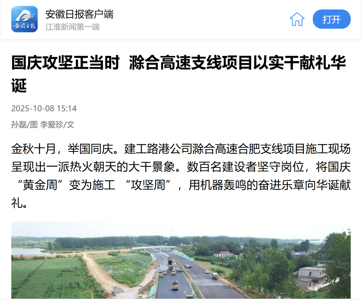 中秋國慶“雙節(jié)”期間,安徽日報對建工路港公司承建的G4222和襄高速項目、滁合高速支線項目等重點項目“雙節(jié)”攻堅大干進行了報道。