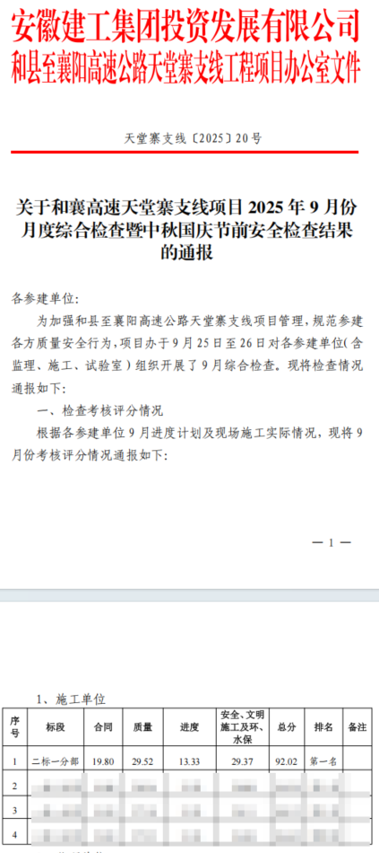 在2025年9月由和襄高速公路項(xiàng)目辦組織的月度及第三季度綜合考評(píng)中,建工路港公司和襄高速天堂寨支線項(xiàng)目二標(biāo)一分部憑借優(yōu)異表現(xiàn),分別榮獲施工單位第一名和第二名,并獲項(xiàng)目辦通報(bào)表揚(yáng)。