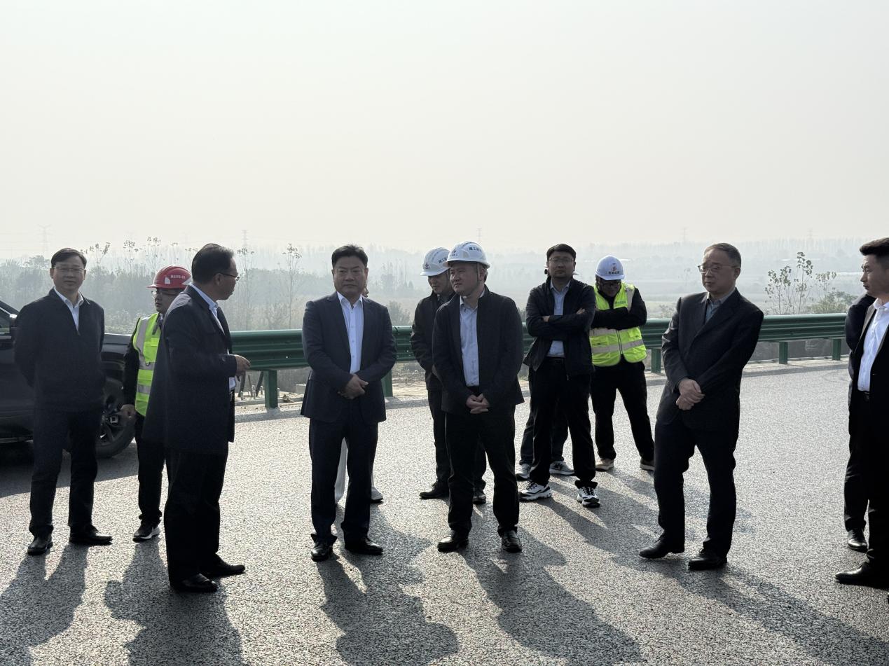 調研中,張平一行深入施工一線,沿項目主線從三十頭樞紐至元疃互通全程察看工程進展。在關鍵施工段落,張平重點檢查了瀝青攤鋪作業(yè)情況,詳細了解施工工藝、材料質量控制和現(xiàn)場組織管理等環(huán)節(jié),并與相關負責人圍繞技術攻堅、節(jié)點推進、安全管控及質量提升等內(nèi)容深入交流,對建設中存在的難點堵點問題進行現(xiàn)場調度。