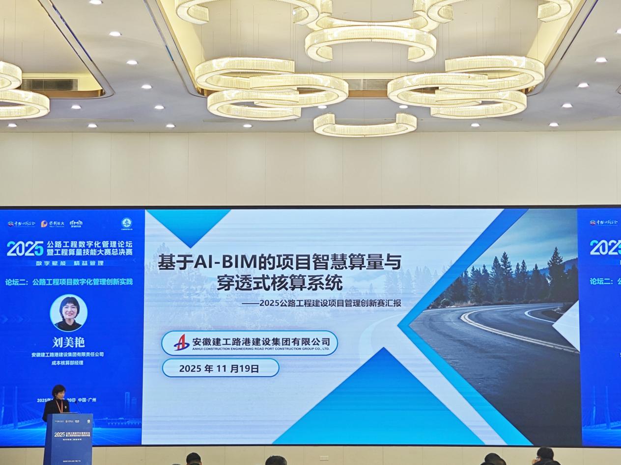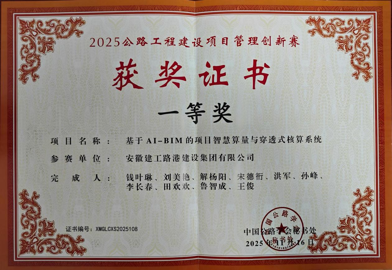 近日,中國公路學(xué)會主辦的2025公路工程建設(shè)項目管理創(chuàng)新賽在廣州成功舉辦,建工路港公司憑借“基于AI-BIM的項目智慧算量與穿透式核算系統(tǒng)”創(chuàng)新型項目,在197個參賽項目中脫穎而出,榮獲創(chuàng)新賽一等獎,得到中國公路學(xué)會各位評審專家的高度認(rèn)可。