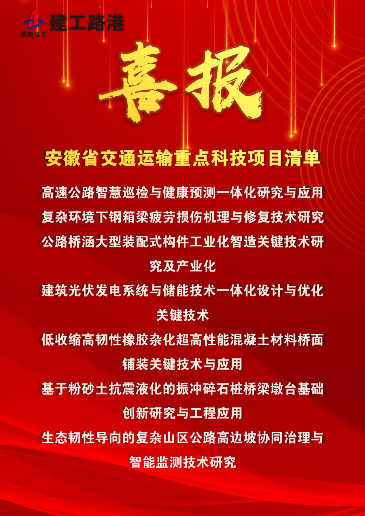 近日,安徽省交通運輸廳科技處發(fā)布2025年度全省交通運輸行業(yè)重點科技項目清單公示,由建工路港牽頭、聯(lián)合安徽建工集團(宿州)項目管理有限公司及安徽建工集團涇縣高速公路有限公司共同申報的7項科研項目全部成功入選,彰顯了公司在交通科技領(lǐng)域的技術(shù)積淀與協(xié)同創(chuàng)新能力。