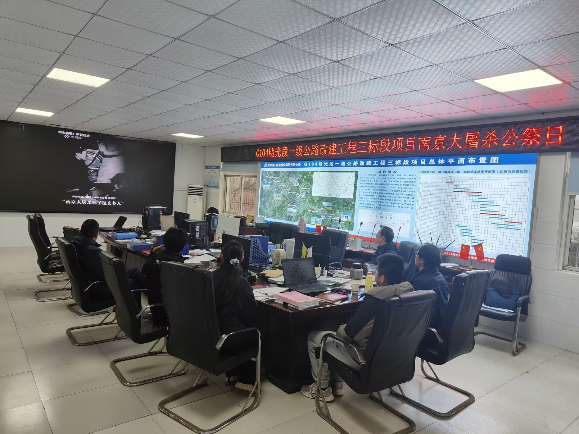 G3京臺高速項目組織全體職工集中收看南京大屠殺死難者國家公祭儀式直播。全體人員肅立默哀,以沉重心情表達對遇難同胞的深切悼念。