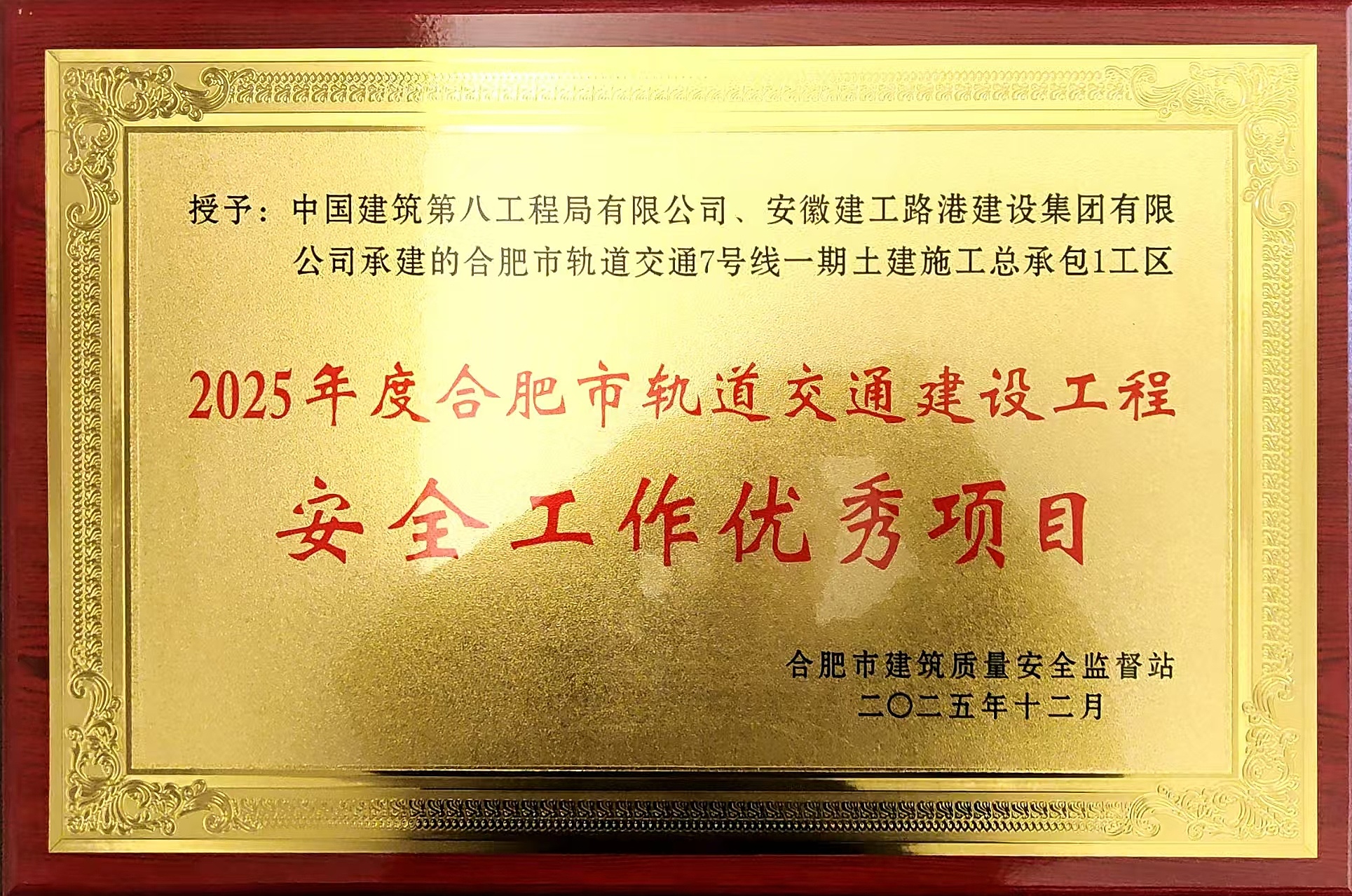 近日,建工路港公司合肥市軌道交通7號(hào)線一期土建施工總承包一工區(qū)項(xiàng)目憑借扎實(shí)的安全管理舉措、優(yōu)異的安全生產(chǎn)成效,獲得合肥市軌道交通建設(shè)工程2025年度“安全工作優(yōu)秀項(xiàng)目”稱號(hào)。
