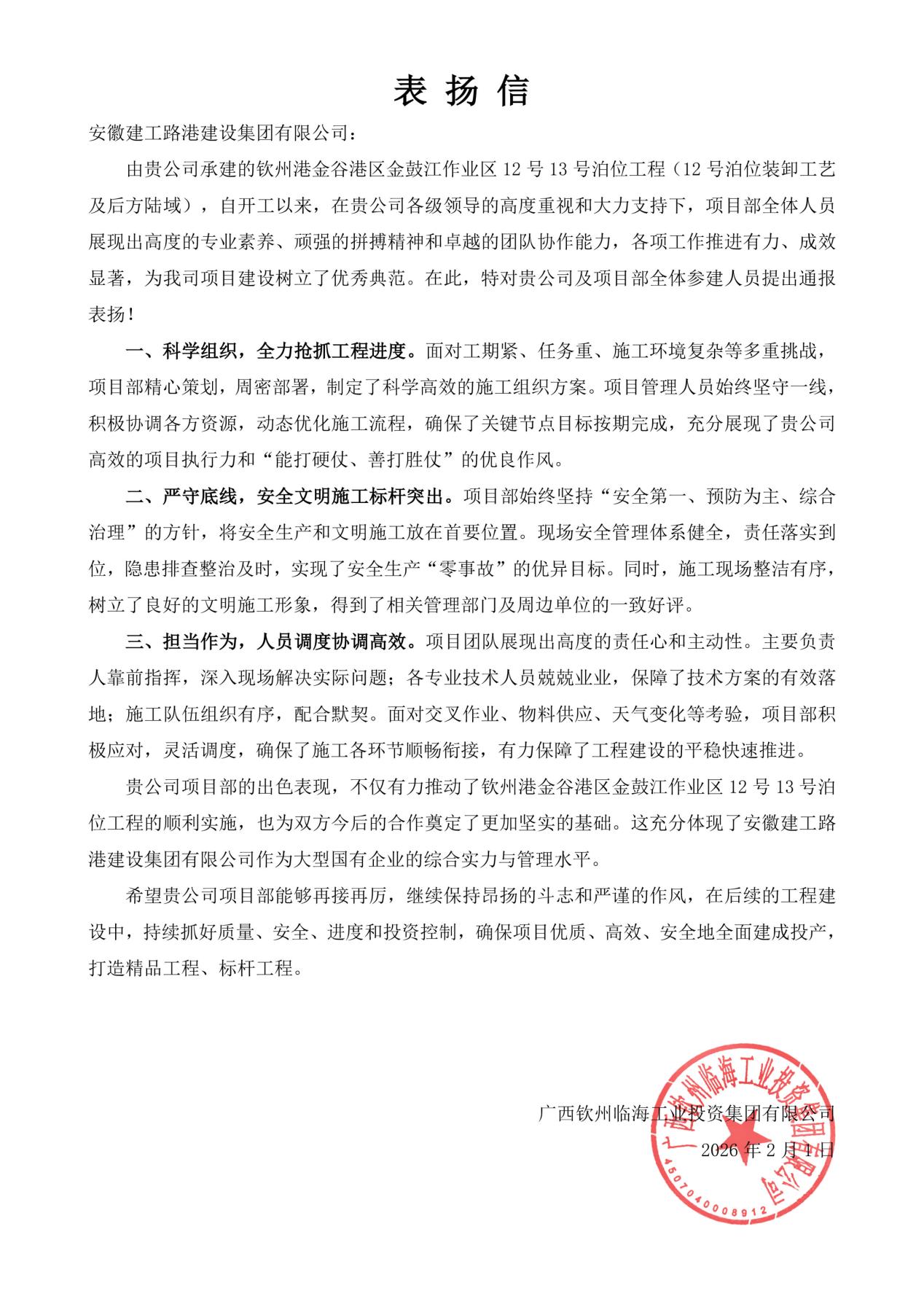2月12日,建工路港公司欽州港金谷港區(qū)金鼓江作業(yè)區(qū)12號(hào)13號(hào)泊位工程(12號(hào)泊位裝卸工藝及后方陸域)收到業(yè)主單位廣西欽州臨海工業(yè)投資集團(tuán)有限公司的表揚(yáng)信。