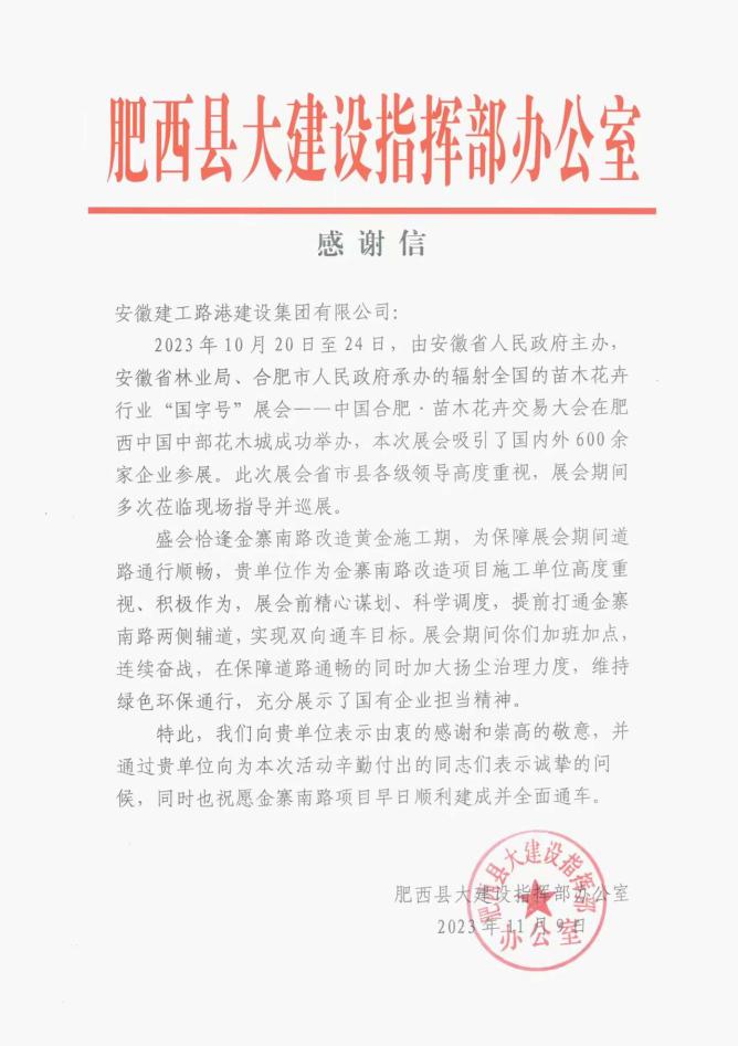 近日,金寨南路(站前路-深圳路)快速化改造2標(biāo)項(xiàng)目收到肥西縣大建設(shè)指揮部感謝信,信中對項(xiàng)目在2023年中國合肥?苗木花卉交易大會(huì)舉辦期間的大力配合表示感謝。