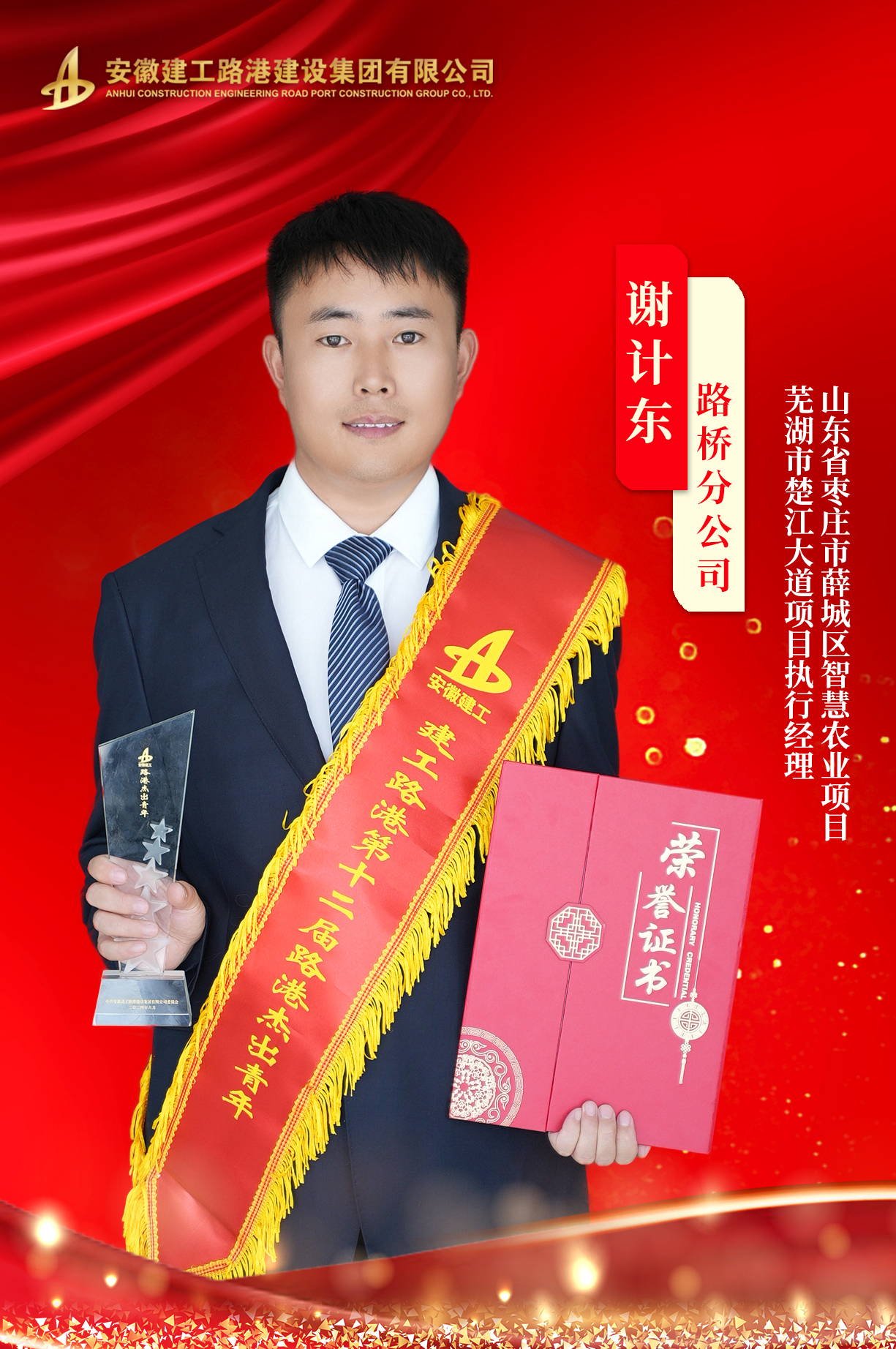 謝計東,男,漢族,中共黨員,本科學歷,工程師,一級建造師,現(xiàn)任建工路港路橋分公司山東省棗莊市薛城區(qū)智慧農(nóng)業(yè)項目、蕪湖市楚江大道項目負責人。