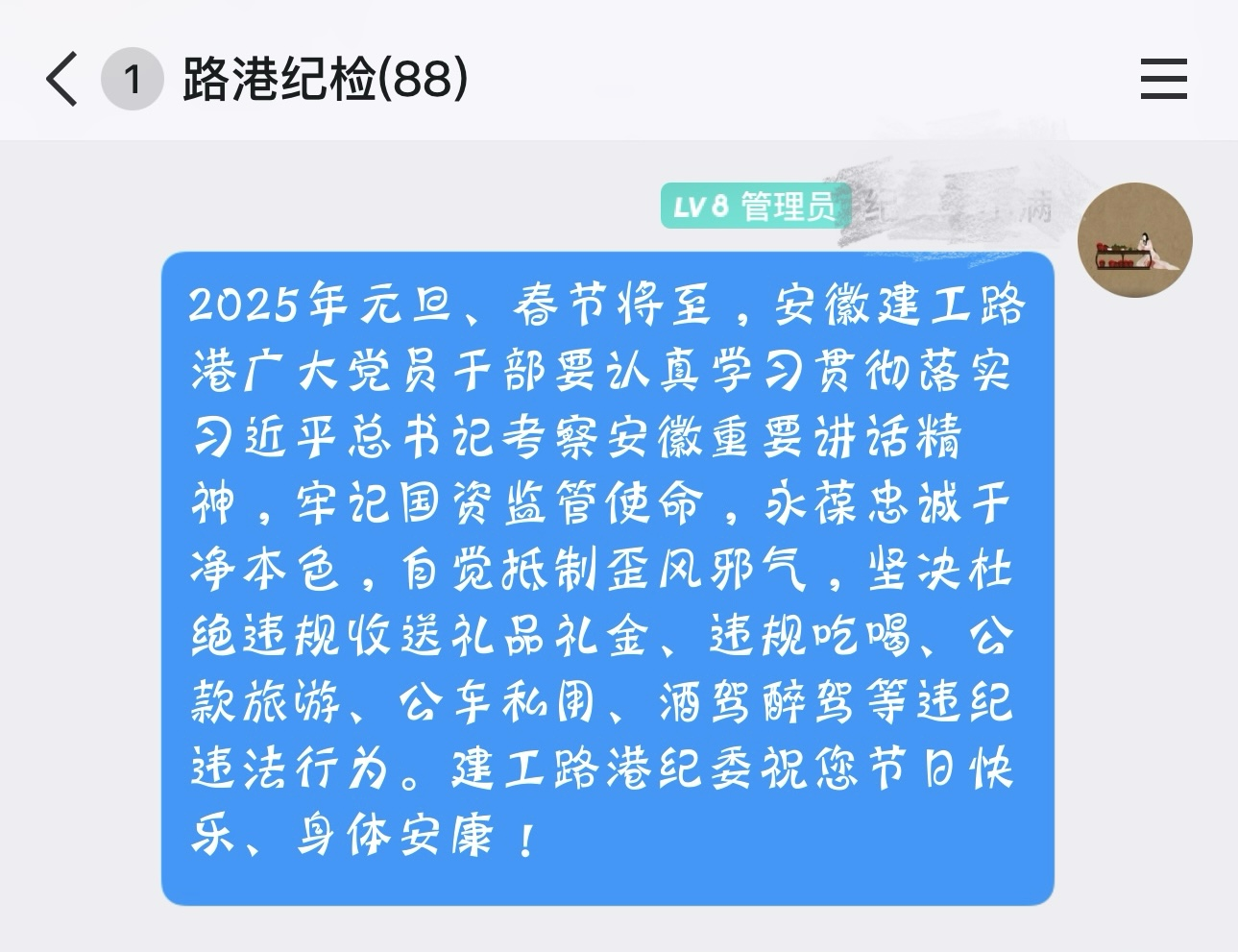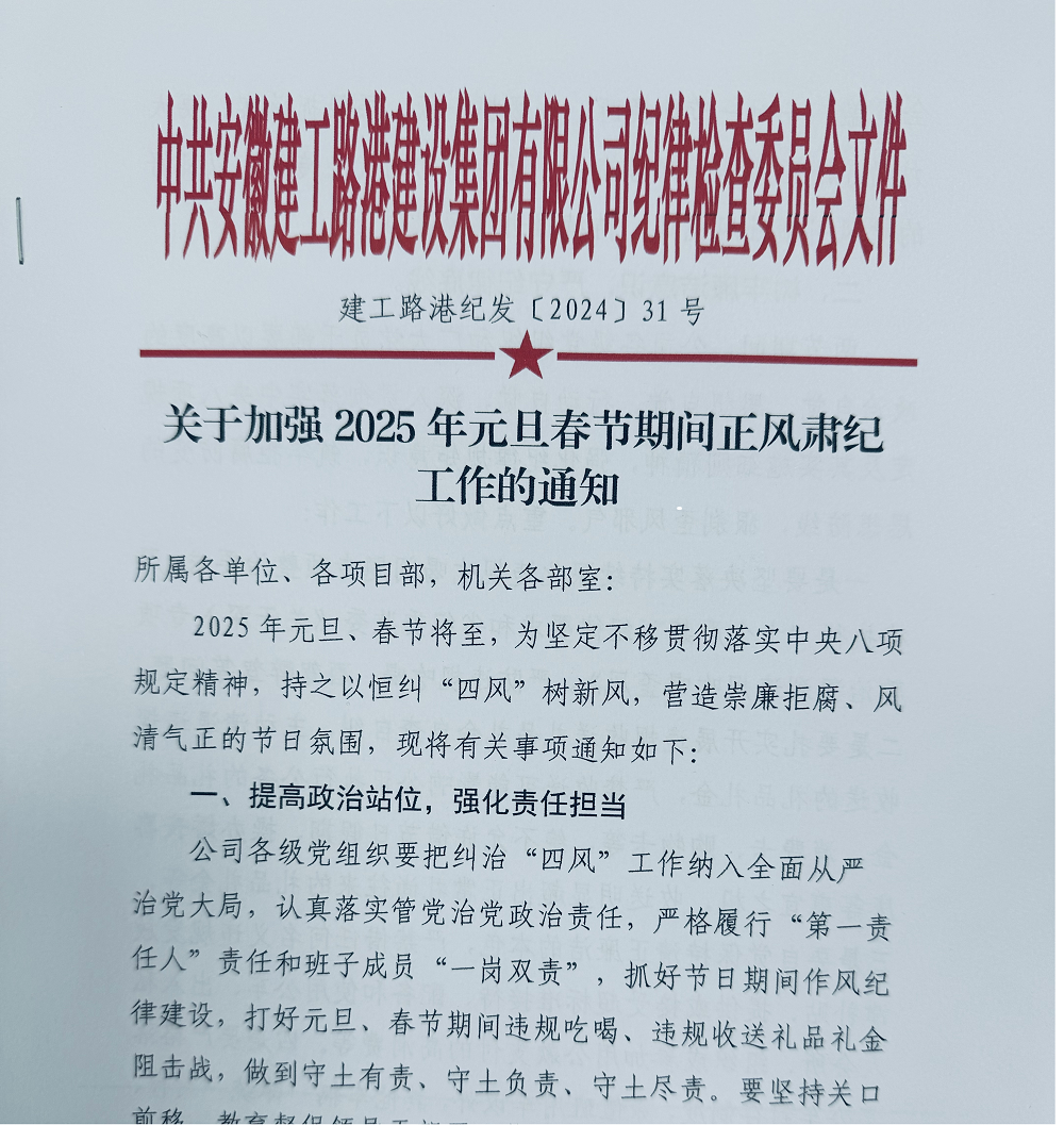 下發(fā)一份工作通知。節(jié)前公司紀(jì)委印發(fā)《關(guān)于加強(qiáng)2025年元旦春節(jié)期間正風(fēng)肅紀(jì)工作的通知》,明確“兩節(jié)”期間落實(shí)全面從嚴(yán)治黨主體責(zé)任、落實(shí)廉潔自律紀(jì)律要求、深化監(jiān)督執(zhí)紀(jì)問(wèn)責(zé)等三個(gè)方面工作要求,督促各級(jí)黨組織堅(jiān)決扛牢作風(fēng)建設(shè)主體責(zé)任,公司紀(jì)委和基層分管紀(jì)檢負(fù)責(zé)人要落實(shí)監(jiān)督責(zé)任,領(lǐng)導(dǎo)班子和黨員領(lǐng)導(dǎo)干部帶頭糾“四風(fēng)”、樹(shù)新風(fēng),強(qiáng)化對(duì)干部職工的教育管理監(jiān)督,堅(jiān)決抵制享樂(lè)奢靡歪風(fēng)。