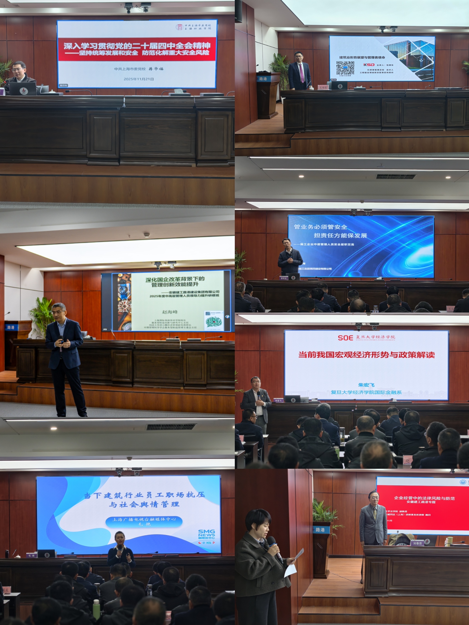 本次培訓(xùn)采用專(zhuān)題輔導(dǎo)形式進(jìn)行,邀請(qǐng)了同濟(jì)大學(xué)、復(fù)旦大學(xué)、上海市委黨校以及建筑、傳媒、咨詢(xún)領(lǐng)域的專(zhuān)家學(xué)者,重點(diǎn)圍繞“國(guó)企改革與管理創(chuàng)新效能提升”“堅(jiān)持統(tǒng)籌發(fā)展和安全,防范化解重大安全風(fēng)險(xiǎn)”“建筑行業(yè)員工職場(chǎng)抗壓與社會(huì)輿情管理”“施工企業(yè)安全管理EHS”“國(guó)企合規(guī)管理與廉潔紀(jì)律”“當(dāng)前我國(guó)宏觀經(jīng)濟(jì)形勢(shì)與政策解讀”“建筑業(yè)形勢(shì)展望與管理者使命”等版塊開(kāi)展系統(tǒng)教學(xué)。