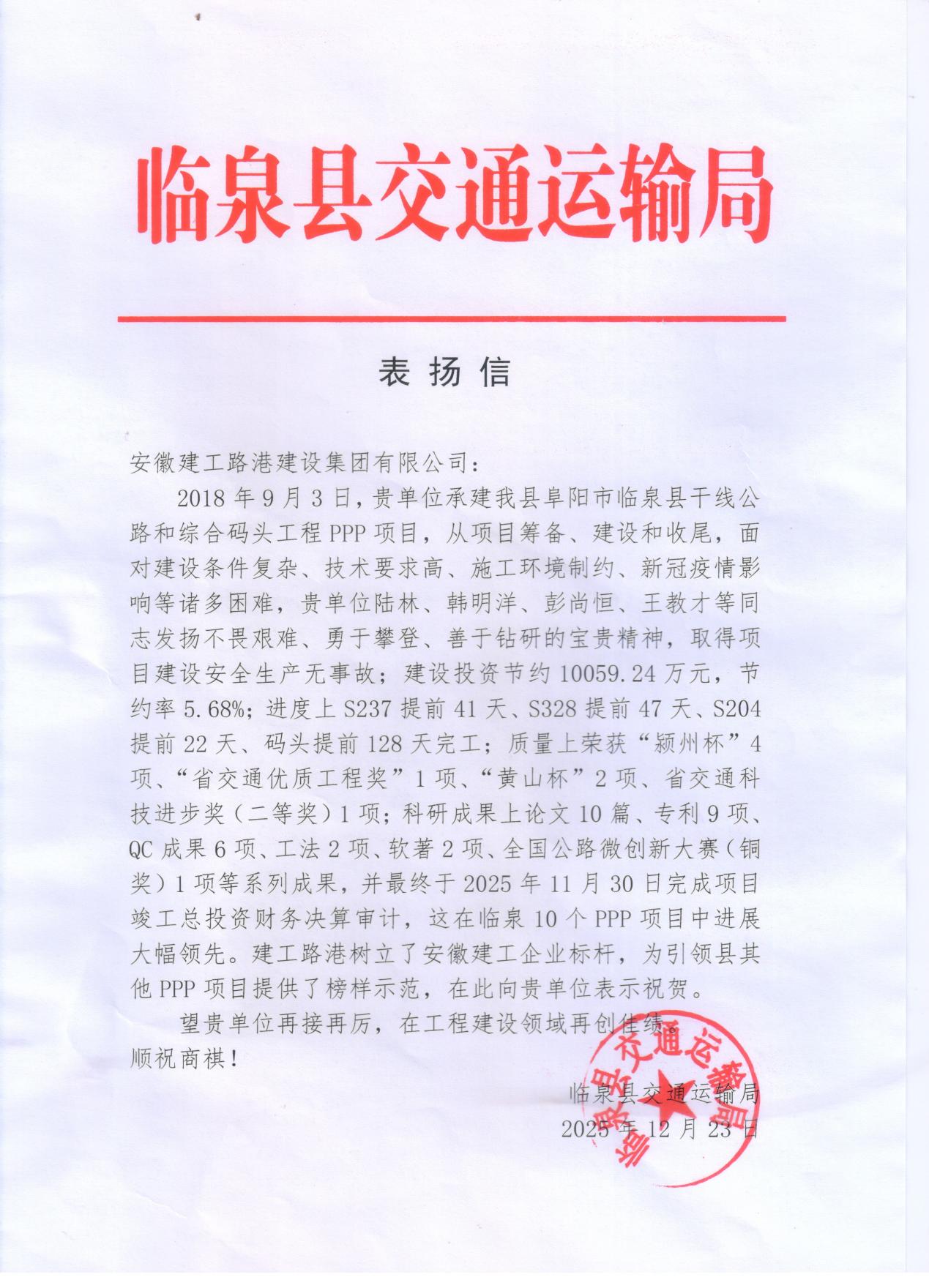 近日,建工路港公司收到臨泉縣交通局表?yè)P(yáng)信。
