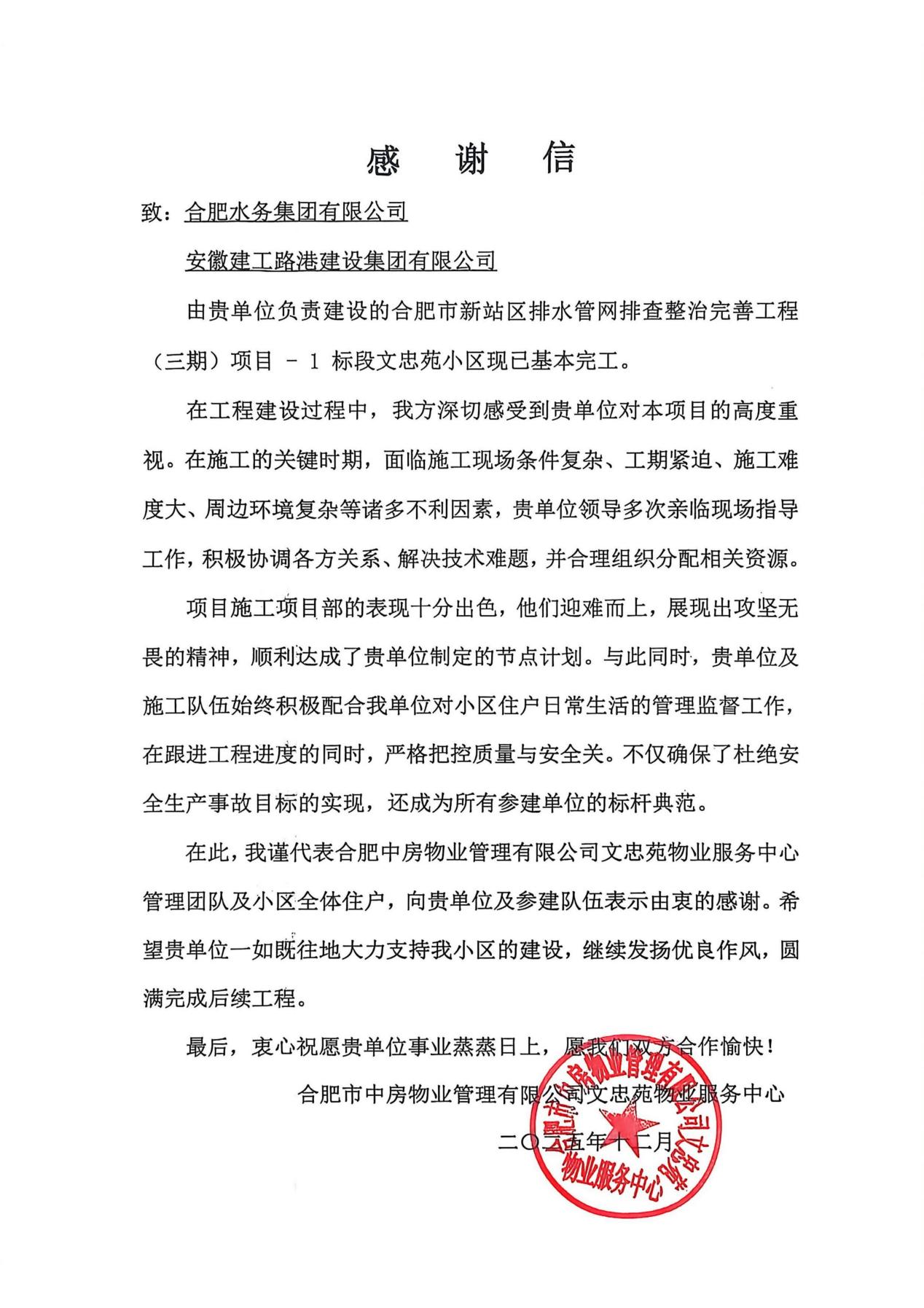 一紙感謝信 一面致謝旗——新站排水管網(wǎng)三期一標(biāo)段項(xiàng)目獲文忠苑物業(yè)致謝