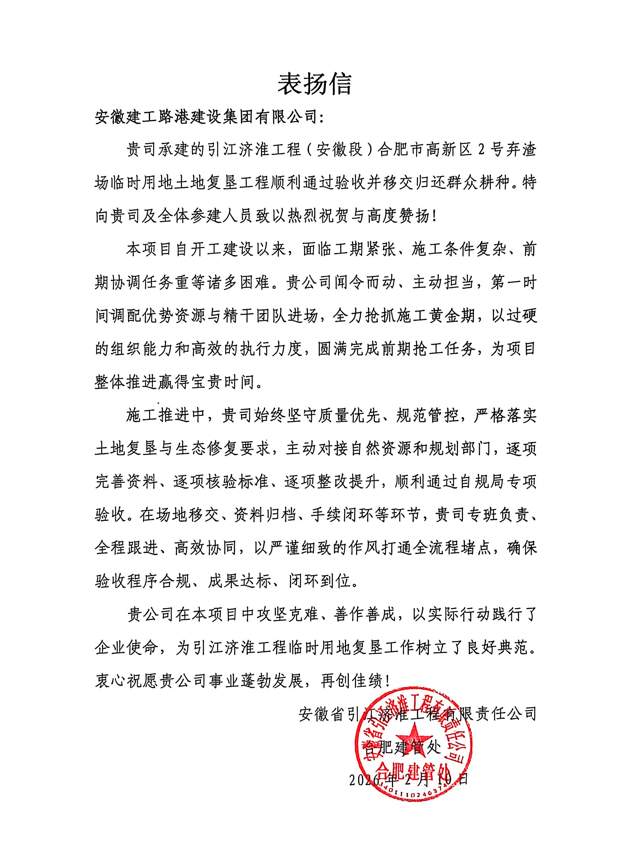 近日,建工路港公司引江濟(jì)淮工程(安徽段)合肥市高新區(qū)2號(hào)棄渣場(chǎng)臨時(shí)用地土地復(fù)墾工程項(xiàng)目收到安徽省引江濟(jì)淮工程有限責(zé)任公司的表?yè)P(yáng)信。